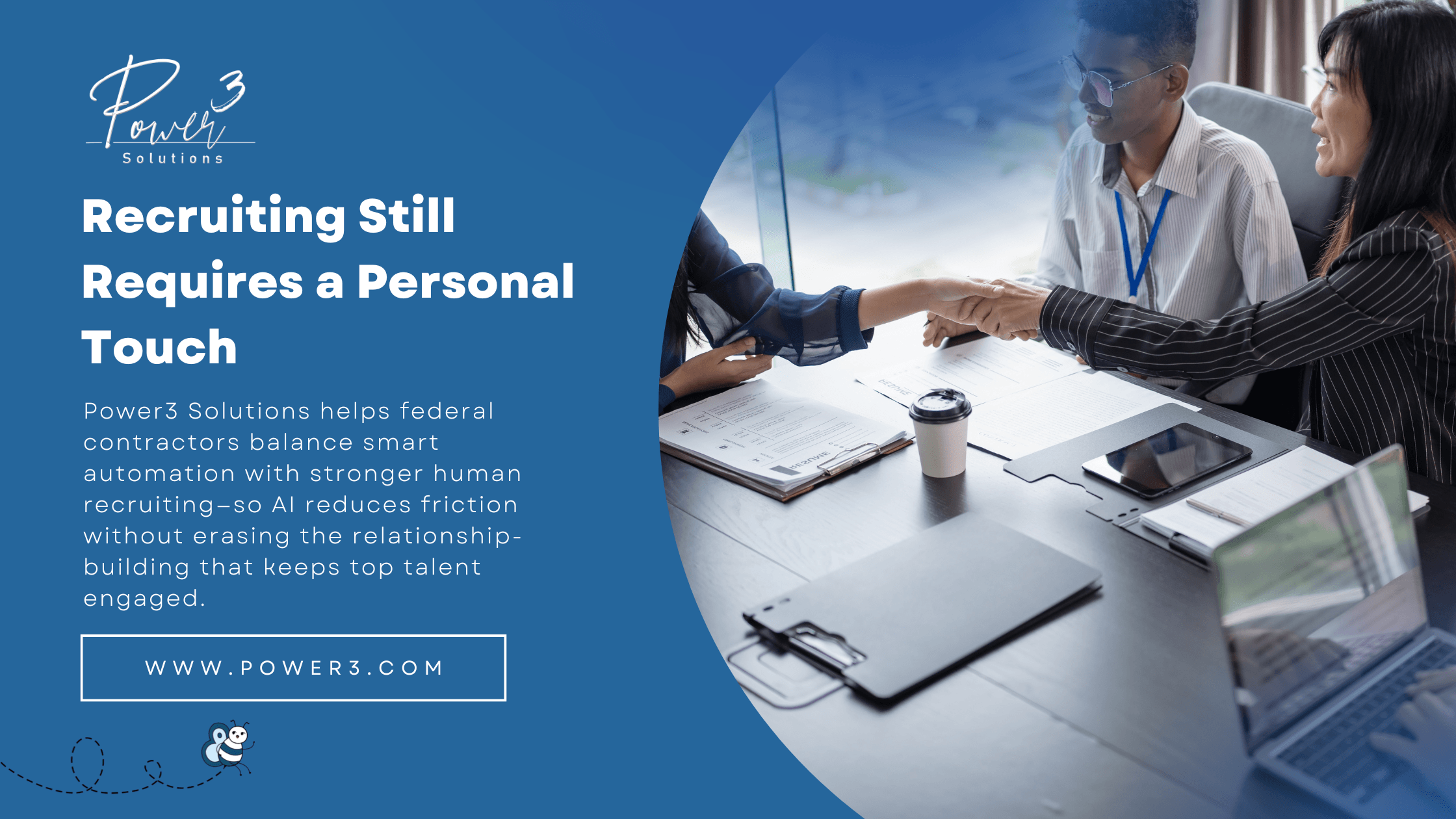 Power3 Solutions helps federal contractors balance smart automation with stronger human recruiting—so AI reduces friction without erasing the relationship-building that keeps top talent engaged. If you want a recruiting model that feels modern, compliant, and genuinely personal, contact Business@power3.com and visit www.power3.com — Your People. Our Mission.